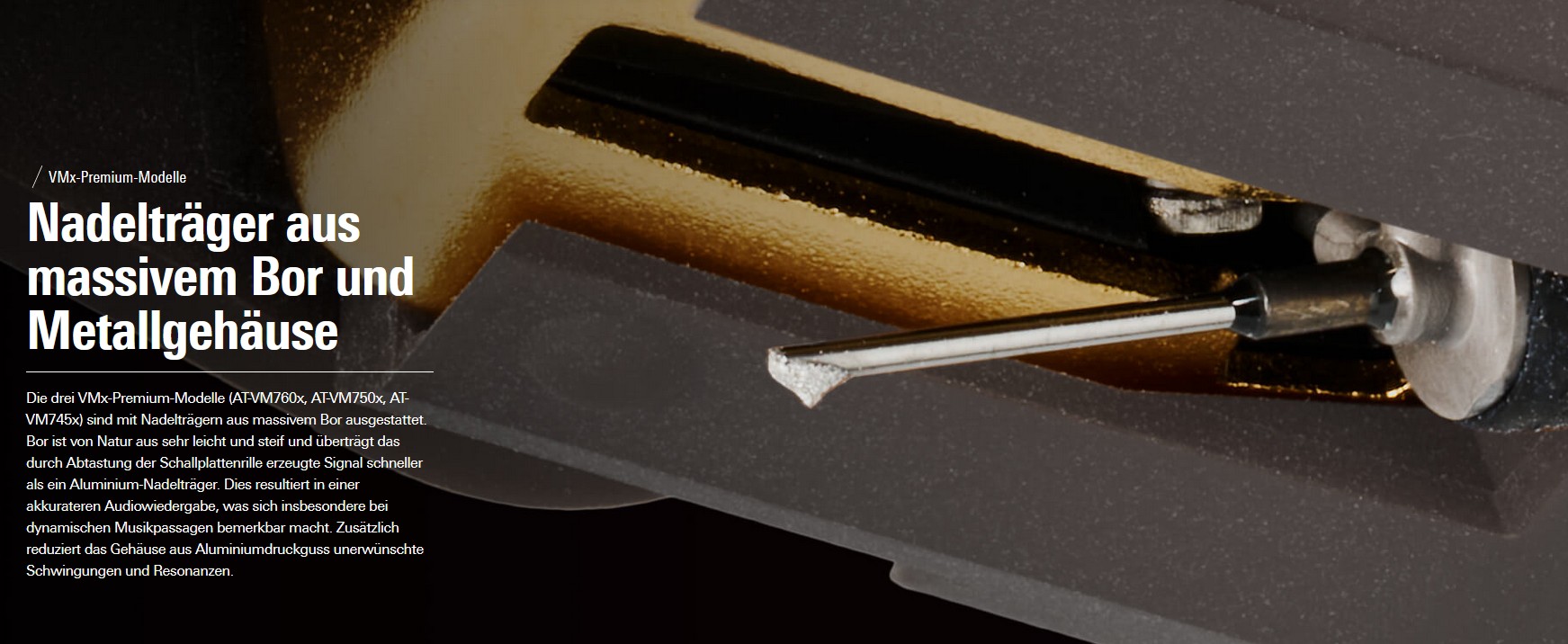 Nadelträger aus massivem Bor überträgt die per Schallplattenrille erzeugten Schwingungen noch schneller