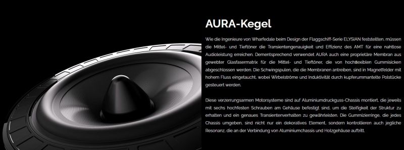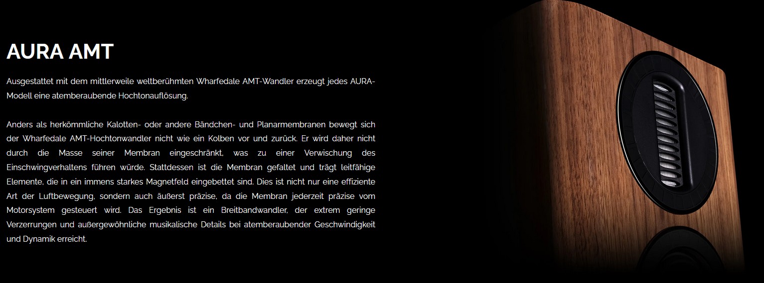 Die fortschrittliche Technologie des Flaggship-Projekts Elysian findet sich in der AURA wieder, wie zum Beispiel der Wharfedale AMT-Hochfrequenzwandler,